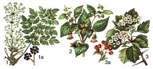 1 – аралия маньчжурская; 1а – плоды; 2 – беладонна обыкновенная (красавка); 3 – боярышник кроваво-красный; 3а – плоды.