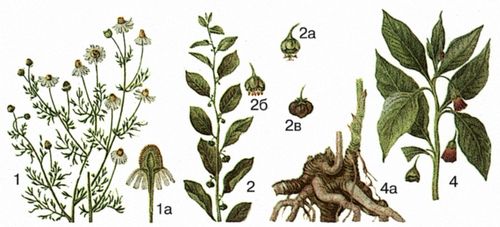 1 – ромашка аптечная, 1а – цветочная корзинка (продольный разрез); 2 – секуринега полукустарниковая, 2а – пестичный цветок, 2б – тычиночный цветок, 2в – плод; 4 – скополия карниолийская, 4а – корневище с корнями.
