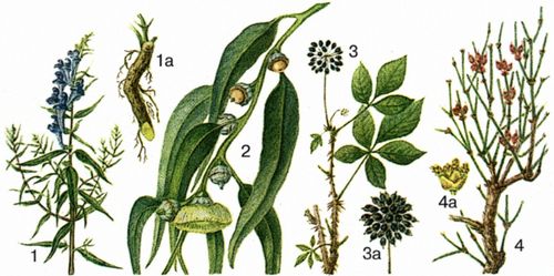 1 – шлемник байкальский, 1а – корень; 2 – эвкалипт шариковый; 3 – электроукокк колючий, 3а – плоды; 4 – эфедра хвощевая (с плодами); 4а – мужской колосок.