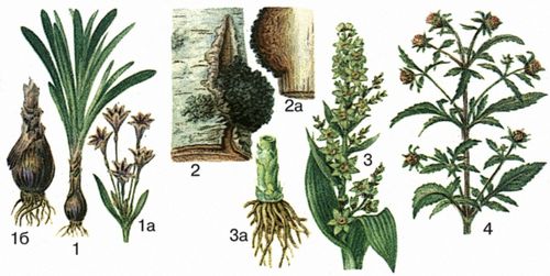 1—1а – унгерния Виктора, 1б – луковица; 2 – чага (плодовое тело гриба на стволе берёзы), 2а – плодовое тело в разрезе; 3 – чемерица Лобеля, 3а – корневище с корнями и основанием стебля; 4 – череда трёхраздельная.