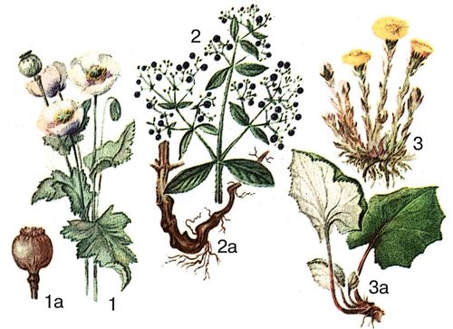 1 – мак снотворный; 1а – зрелая коробочка; 2 – марена красильная (грузинская разновидность); 2а – корневище с корнями; 3 – мать-и-мачеха в фазе цветения; 3а – листья.
