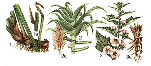1 – аир болотный, 1а – соцветие; 2 – алоэ древовидное, 2а – соцветие; 3 – алтей лекарственный, 3а – корневище и корни.
