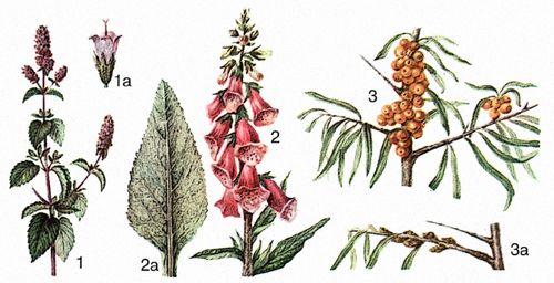 1 – мята перечная; 1а – цветок; 2 – наперстянка красная; 2а – лист; 3 – облепиха крушиновидная; 3а – ветвь мужского растения.