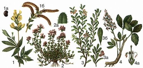 1 – термопсис ланцетовидный (ланцетный), 1а – семя, 1б – плоды; 2 – тимьян ползучий, 2а – часть листа; 3 – толокнянка обыкновенная, 3а – ветвь с плодами, 3б – лист; 4 – трилистник водяной (вахта трёлистная), 4а – цветок (продольный разрез).