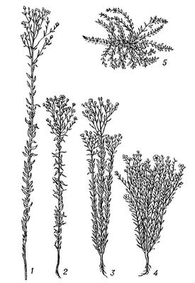 Группы разновидностей льна: 1 – долгунец; 2 – 3 – межеумок; 4 – кудряш; 5 – стелющийся полуозимый.