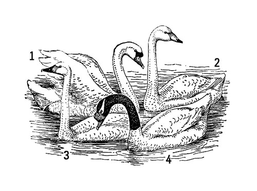 Лебеди: 1 – шипун; 2 – кликун; 3 – малый; 4 – черношеий (Юж. Америка).