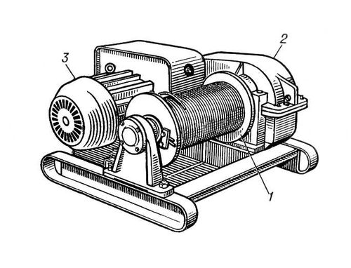 Рис. 1. Электрическая лебёдка с тяговым усилием 3 кн (0,3 тс): 1 – барабан с канатом; 2 – редуктор; 3 – электродвигатель.