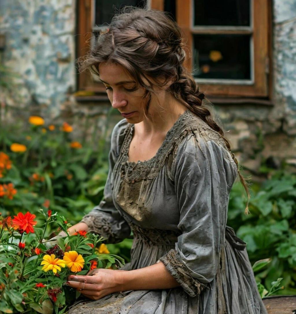 В клумбе возле дома что то делала женщина, пусть и не молодая но всё ещё красивая. В сером платье, которое было измазано землёй, а русые волосы были заплетены в косу.