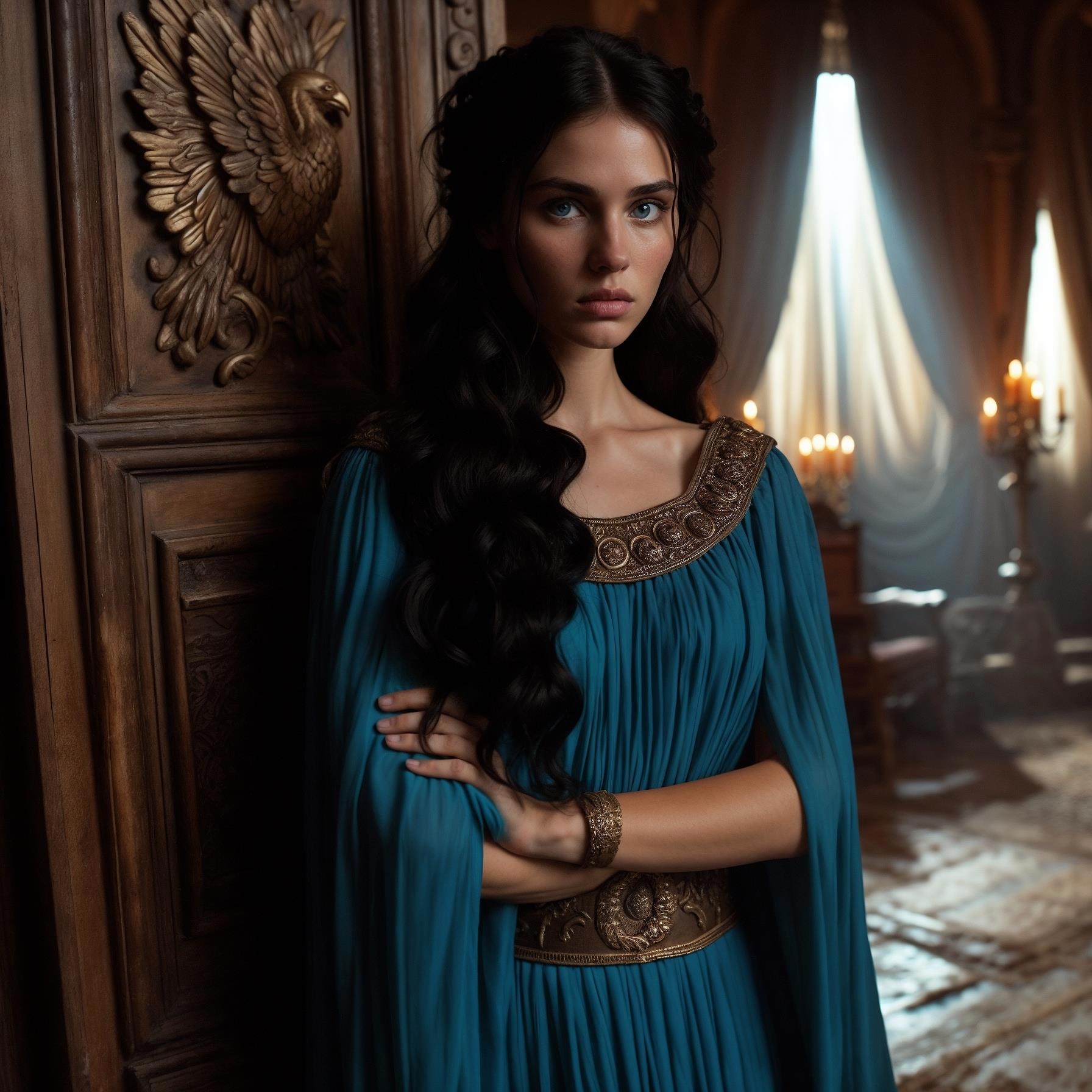 В глаза бросилась синяя ткань, что лежала на кровати. Думала, что это часть простыни, но подойдя ближе, поняла, что это платье. Одевшись и закрепив его, занялась своими "доспехами". Оторвав кожаные ремни, затянула их на ноге выше колена и убедилась, что ножи держатся крепко. Проверила, как быстро смогу их вытащить.