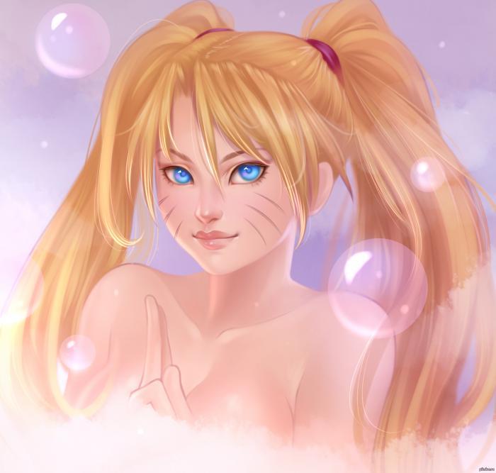 Следом блондин сложил печать и из облачка дыма на том месте, где до этого стоял Наруто, появилась в эротичной позе обнажённая сексуальная девушка со светлыми волосами, заплетёнными в два хвостика, и большими округлыми формами, которые, к счастью или к сожалению, были скрыты за туманом. Спасибо цензуре.