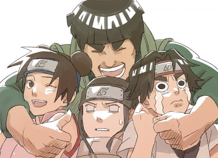 Подняв свой взгляд Рок, Тентен и Неджи увидели перед собой такую картинку, как мужчина в зелёном комбинезоне с причёской горшок и густыми бровями, даже более густыми, чем у Ли, отжимался на пальцах и стоял на них же, разом, покуда на ступнях у него восседал скорее всего ярко улыбающийся двойник, на плечах которого находился опять-таки ещё один клон.