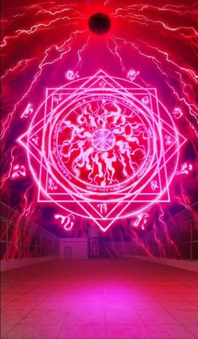 В следующий момент область в десять метров изнутри окрасилась в алый цвет. Как будто бы красные молнии спустились с неба на землю, покуда на вершине в самом центре сиял кровавый глаз. Натуральный человеческий зрачок...