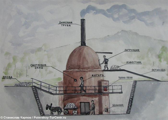 Сама печь находилась в глубокой яме, таким образом позволяя рабочим засыпать известняк в верхний отдел, проходя по сбитым вместе доскам.