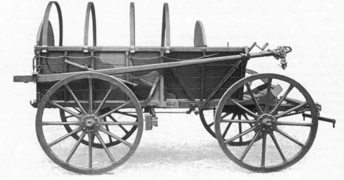 Такие телеги отличались от обычных, более крупными колёсами, которые должны были позволить солдатам толкать их, если те застрянут в грязи и более прочными осями усиленными железными скобами, чтобы выдерживать больше веса.
