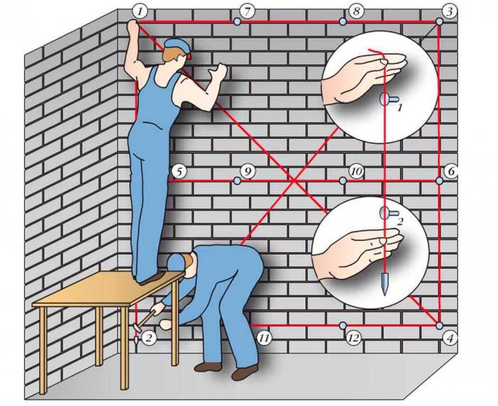 В дальнейшем верёвка уже привязывалась к самой стене и по ней возводили до самого конца, а для вертикальной точности, к одной стороне верёвки подвешивался небольшой груз, который помогал определять крен стены.