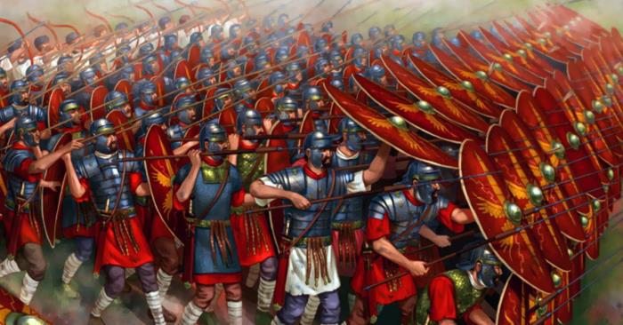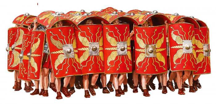 «Черепаха» – выглядела как квадрат, в котором все солдаты закрывали щитами лобовую часть, верхнюю и боковые, оставляя открытой лишь тыл.