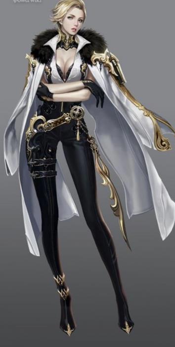 Сама одежда была белоснежной, с чёрными вставками и золотыми пуговицами. Вместо сапог использовались чёрные туфли на высоком каблуке, такого же типа, что он сделал для Шоны.