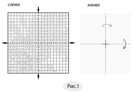 Данная инструкция по вышиванию крестом поможет вам понять, как правильно вышивать по схеме и с чего начать. Определите центр вышивки, сложив канву вчетверо. Он соответствует центру схемы, который определяется двумя пересекающимися линиями со стрелками на концах. Обратите внимание, что схема не отражает готового размера вышивки. Клеточки на схеме соответствуют квадратикам на канве. Пустые клеточки обозначают не вышиваемые участки (Рис. 1).