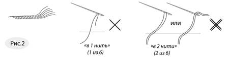 Пасма мулине состоит из 6 нитей. Чтобы готовая работа не отличалась от фото на обложке набора и во избежание недостачи мулине, используйте строго указанное в схеме набора количество нитей. На Рис. 2 показано, что обозначает "вышивка в 1 нить" и "вышивка в 2 нити".