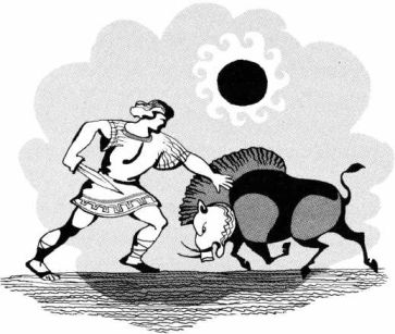 И вот Тесей, решив поймать марафонского быка, отправился на его поиски. Он нашел его и вступил с ним в борьбу, которая была очень трудной; но отважный Тесей сумел накинуть петлю ему на рога и ноги и, связанного, привел в Афины.