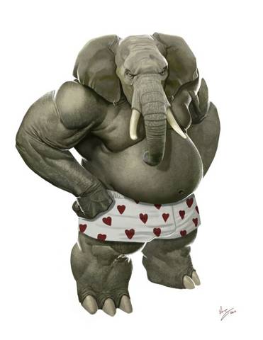 Вот такой персонаж в веселеньких труселях. Слон, стоящий на двух ногах, поманил меня пальцем руки, и я конечно же пошел к нему.
