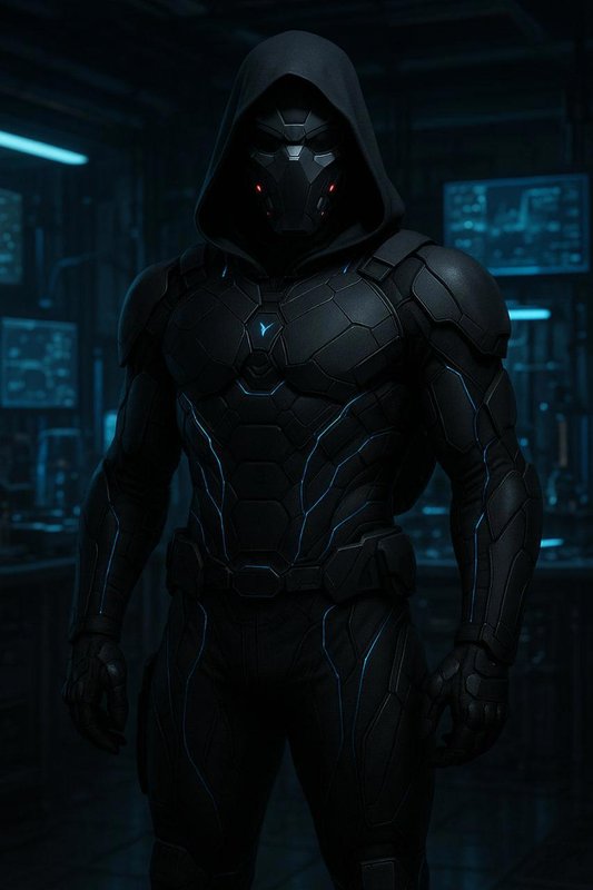 В целом, дело оставалось за малым – объединить все в единый образ. Это не громоздкая броня. Костюм получился тонким, анатомическим, почти органическим. Основа – облегающий комбинезон из темно-серой матовой ткани. Поверх него – сегментированные, угольно-черные панели «Протея», повторяющие линии основных групп мышц. Силуэт дополнял глубокий капюшон, скрывающий верхнюю часть головы и маску, создавая хищный, безликий образ.