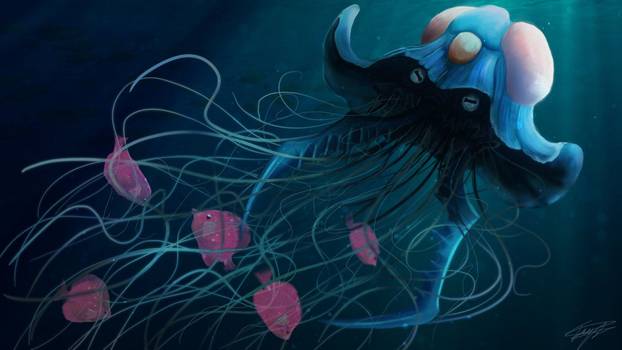 Мисти во всю любовалась всплывающей махиной. Да и я тоже, пусть уже и представлял себе его размеры, очерченные границами ауры, но такого ожидать не мог никак. Дыра, из которой тот вылезал, обладала шириной под полсотни метров, и даже так она впритык пропустила через себя жемчужины – единственную жесткую часть медузьей шляпки, не считая хитиновых жал, что растут на манер щупалец. Пропустила их не одновременно, но одну за одной. Все остальное же… Ну, желеобразное создание может пролезть практически везде. Полностью покинув свое обиталище, гигантская тварь зависла над ним, заполонив собою практически весь грот.