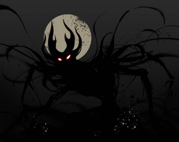Постепенно генгар начал расти, а вид его преобразовывался, в очередной раз показывая, что внешность, которую используют покемоны-призраки, зависит только от их разума. Используя окружающие тени как проводник, Орион стремительно преобразовывал собственное тело, все сильнее насыщая его энергией темного пространства, пока в конечном итоге посреди поляны не завис четырехметровый абсолютно черный гигант, торчащий из земли лишь наполовину. Руки, ранее напоминающие толстые обрубки, обратились в две пары изящных длинных конечностей, с тонкими, словно костяными пальцами, оканчивающимися острыми даже на вид когтями. Уши покемона преобразовались в длинные заострённые рожки придавая Ориону сходство с какой-то адской потусторонней тварью, а пара пятен, особо выделяющихся среди всей этой черноты – пара слегка светящихся краснотой глаз, лишь укрепляли это сходство. Из спины, плеч и даже из головы монстра начали появляться длинные тонкие жгутики, бессистемно хлестающие воздух вокруг покемона, иногда походя срубая деревья, словно тех и не было на пути.