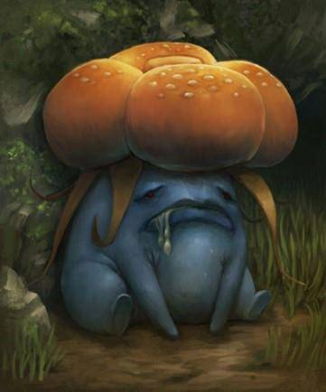 Эрика вытащила, буквально за «подмышки», еще один гриб, но уже не имеющий ни цветочных корневищ, ни лепестков. Сравнительно небольшой, метр в высоту и столько же в ширину, в основном из-за широкой шляпки, покемон был поставлен на землю, представ перед нами во всей красе. Вайлплюм – развитая форма глума, является, по своей сути, огромным ядовитым грибом, выбрасывающим огромное облако спор при малейшем раздражении. И если из «лепестков» его грибной шляпки выделяются сравнительно безобидные споры, обеспечивающие полный паралич, а при высокой концентрации еще и деградацию центральной нервной системы, то вот из углубления в центре шляпки могу появиться и крайне ядовитые соединения, с огромной скоростью превращающие источник раздражения в обед… Вайлплюмы, как и прочие растения, отлично переваривают свежий перегной.