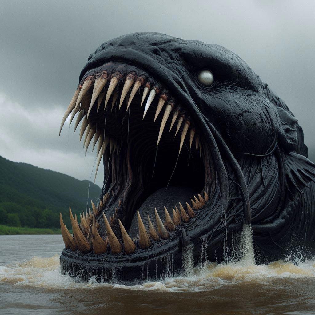 Раздался громкий всплеск, и на поверхность вынырнула огромная, широкая голова с пастью.