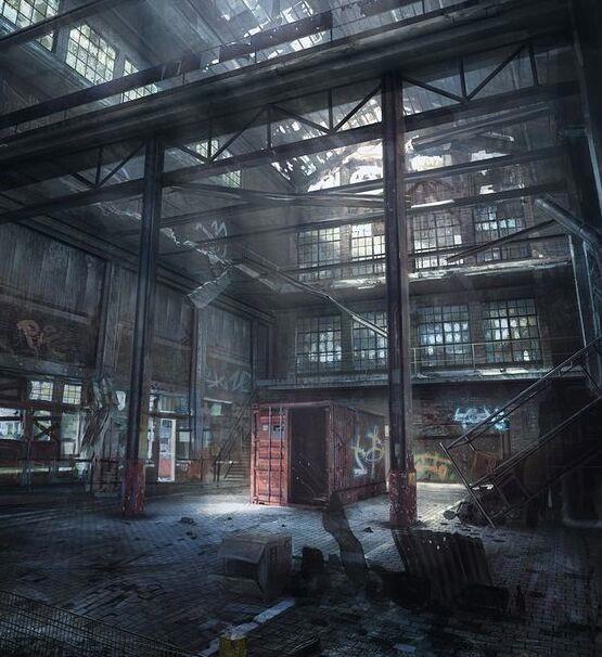 Крыша местами была разрушена, сквозь прорехи свет едва проникал, отчего в просторном помещении было темно. Также наблюдалось множество стальных ржавых лестниц, местами покосившихся, а в некоторых вообще кое-где отсутствовали ступеньки.