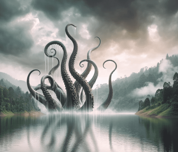В центре Чёрного Озера закружился огромный водоворот. Из бурлящей поверхности выстрелили гигантские тёмно-пурпурные щупальца. Одно из щупалец, прорезая воду и разбрызгивая капли, устремилось к трибунам.