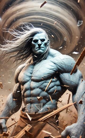 Троица услышала хриплый каркающий смех и мерные спокойные шаги. Порыв ветра развеял дым и взвесь из пыли. От увиденного сёстры застыли, позабыв как дышать. Гигант под два метра. Мускулистый обнаженный торс, будто у какого-то бодибилдера, бледно-синяя кожа. Длинные растрёпанные волосы цвета пепла, кривая ухмылка. Вокруг гиганта закручивался ветряной смерч, в котором виднелись осколки стекла, штукатурки и древесных щепок.