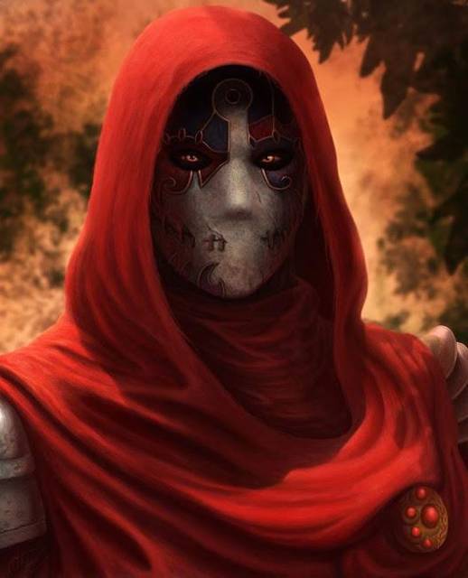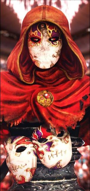 На богатой части трибун, для знатных зрителей, что была украшена богатой мебелью, появилась загадочная личность. Высокий, стройный мужчина в малиновом капюшоне, серых доспехах. Самым выделяющимся в его внешнем виде была белая маска с красными и золотыми символами, закрывающая всё, кроме красных глаз. Кроме того, к его поясу было прикреплены ещё две маски, похожие на ту, что носит он.