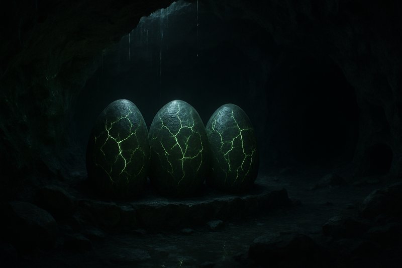 Еще сквозь мрак увидел у дальней стены, в неглубокой нише какой-то большой, овальный камень. Он разительно отличался от остальной, угловатой породы. Подойдя ближе, заметил еще парочку таких же. Прикоснулся к одному из камней. Он был покрыт странным, будто бы кожистым налетом и… излучал едва заметное тепло. Но стоило мне обойти такие камни со всех сторон и прощупать их, как по гладкому камню прошла сеть тонких, светящихся трещин. А изнутри донесся глухой стук…