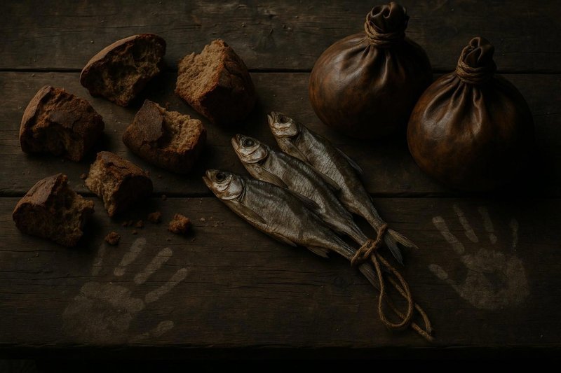 Раб, несший мешок, вывалил его содержимое на стол. Очевидно, нес в нем наш завтрак. Состоял он из кусков старого хлеба и вяленой рыбы. Рядом поставили пару кожаных бурдюков с водой.