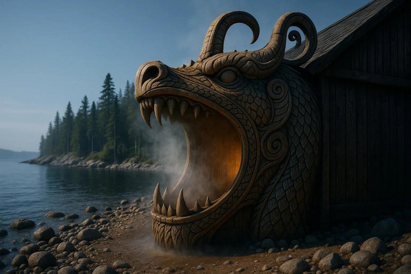 Банный комплекс, или, как они его называли местные, «парилка», куда меня повели, оказался на берегу небольшой бухты, немного в стороне от основной деревни. Раньше я не обращал на него внимания, но сейчас, подойдя ближе, я обомлел. Вот буквально! Кто еще мне скажет о дикости народа, я тому буду тыкать в лицо своими воспоминаниями о их творчестве. Вход в главное здание был выполнен в виде гигантской, вырезанной из дерева головы дракона с разинутой пастью. Резьба была невероятно детализированной и жуткой. Огромные, кривые зубы, спиралевидные рога, чешуя, каждая пластинка которой была тщательно проработана. Вот прям… нет слов. Насколько круто и качественно было сделано, что стоило только восхищаться. А еще и в тему – только зайдя через вход, сразу ощутил поднимающуюся температуру воздуха, словно реально оказался в пасти дракона.