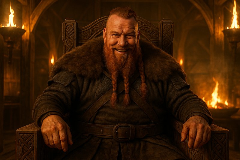 Он был огромен, каким и помню его в первые минуты встречи. Густая рыжая борода спускалась на широкую грудь, заплетенная в несколько кос с вплетенными в них металлическими кольцами. На руках, толстых, как стволы молодых деревьев, виднелись многочисленные шрамы. Но больше всего поражали его глаза. А смотрели они на меня в упор, без тени улыбки, пронизывая насквозь. Рядом с ним сидел Бьорн, который и указал мне, где встать.