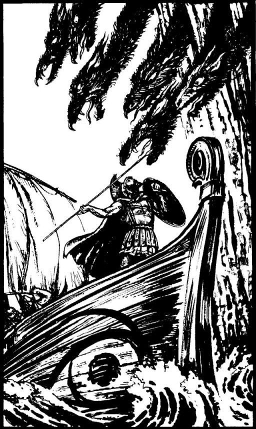 Внезапно в вышине над ними послышался многоголосый лай, словно свора злобных собак мчалась навстречу к ним вниз по скале. На миг путники увидели над собой горящие глаза и чудовищные морды с оскаленными зубами. Страшные пасти схватили шестерых гребцов и взвились наверх. Одиссей не успел даже поднять копья. Он только увидел, как мелькнули над его головой руки и ноги несчастных, да услышал их последний отчаянный призыв.