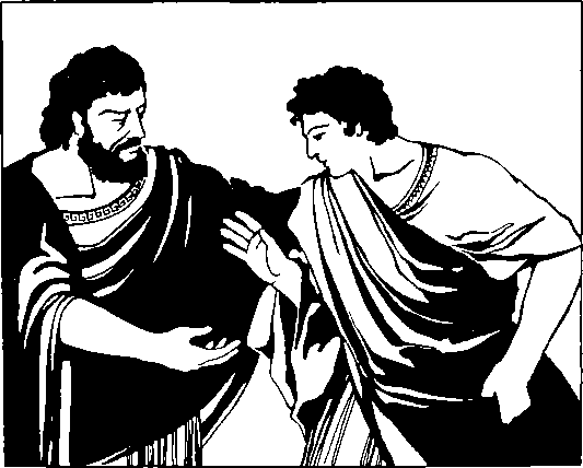 Эвмей взял копье из рук Телемака помог ему расстегнуть ремень у блестящего шлема. Юноша вошел в дом. Старый нищий поспешно встал перед юным воином, но Телемак удержал его словами: