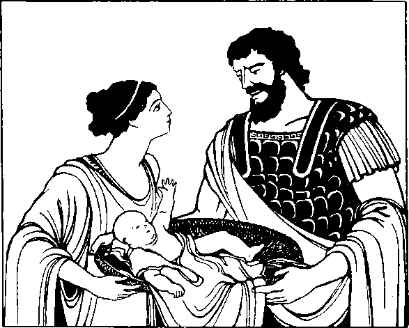 Оставив Андромаху, Гектор хотел взять на руки маленького Астианакса. Но ребенок с криком прижался к няне, испуганный яркой медью на груди отца, его сверкающим шлемом с грозно развевающимся конским хвостом на гребне. Гектор засмеялся, и даже заплаканная Андромаха улыбнулась. Немедленно снял Гектор с головы блистающий шлем и положил его на землю. Успокоенный младенец, узнав отца, доверчиво потянулся к нему и обнял его за шею мягкими ручками. Поцеловав сына, Гектор высоко поднял его и обратился с мольбой к богам: