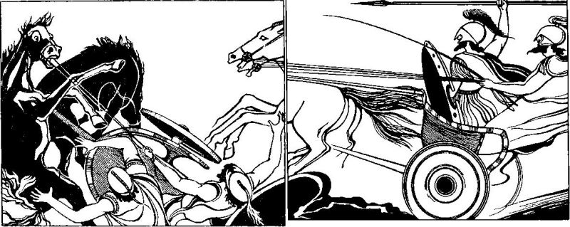 На широкий двор своего медностенного дома Зевс выкатил колесницу; вся она светилась чудесным светом: блестели серебряные спицы и золотые ободья колес, золотые поручни, кузов, сплетенный из золотых и серебряных ремней; серебряное дышло. Зевс запряг в колесницу двух крылатых коней с медными ногами. Их золотые гривы падали волнами до самой земли. Кони храпели и били копытами, но позволили богу надеть на себя золотое ярмо, привязанное к дышлу колесницы. С громом распахнулись ворота, и чудесная упряжка вылетела наружу. Послушные могучему вознице, кони распростерли сверкающие крылья и полетели, паря между морем и высоким небом.