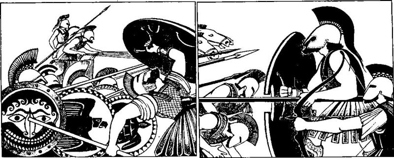 Как непробиваемая стена, сплотились они щит к щиту; они отбивались от наседавших троянцев и передавали все новые копья могучему Атриду, славному копьеметателю. Удары его не пропадали впустую. Он уже отбил не одно нападение Гектора.