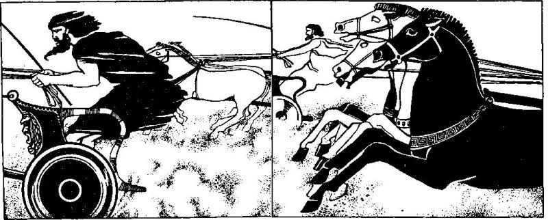 Пять колесниц выстроились в ряд; возницы разом занесли бичи, разом хлестнули коней и громко крикнули; и разом помчались кони, подымая облака пыли, по ристалищу. Вдали виднелось воткнутое в землю копье – назначенная мета. Вскоре кони по очереди обогнули мету и поскакали обратно. Среди ахейцев поднялись крики и споры; самые пылкие бились об заклад. Но уже всем было ясно, кто победитель: вперед вынеслись жеребцы Диомеда. Они летели, расстилаясь по полю, и далеко опередили всех остальных. Вторым мчался Менелай; изо всех сил он погонял своих легконогих кобылиц. За ним неслись не отставая кони Антилоха. Вдруг, на ухабистой части дороги, Антилох диким криком и ударами стал понукать своих коней; они вырвались вперед, сравнялись с конями Менелая. Спартанский царь видел, что на первом же ухабе колесница его будет опрокинута. Поневоле он придержал коней и пропустил вперед юного возницу. Торжествующий Антилох проскакал мимо Атрида, не обращая внимания на его гневные жесты.