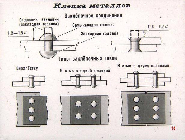Раскалённые клёпки, продевались в заранее проделанные в металлических листах отверстия и молотом прессовались с обратной стороны. Таким образом, у клёпки появлялась шляпка, как у гвоздя, только с двух сторон.