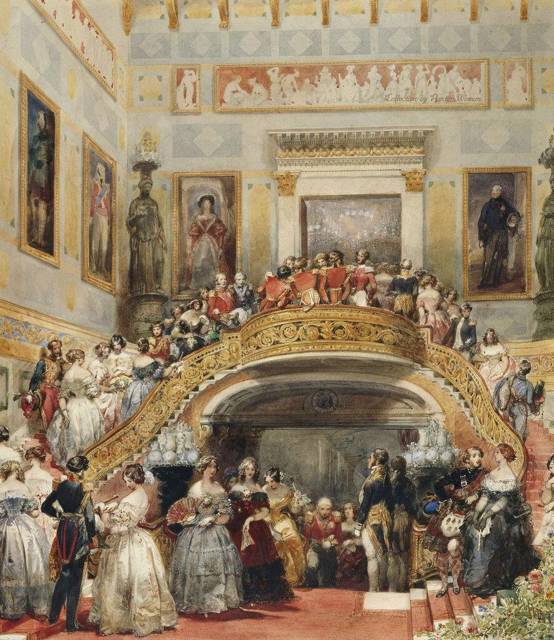 (сбор гостей на той самой узкой лестнице в старом здании Букингемского дворца)