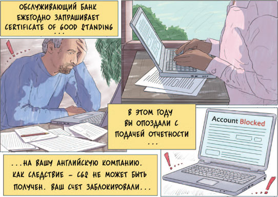 Если к дате продления компании ежегодная госпошлина не будет уплачена в бюджет, то на следующий за установленной датой продления день статус компании изменится – напротив ее наименования в государственном реестре появится запись: “Not in good standing”. Компании, находящиеся в этом статусе, хотя еще и не вычеркнуты (исключены) из реестра, но уже ограничены в своей правоспособности, и им может быть отказано в получении каких-либо сертификатов, подтверждающих их статус – как корпоративный, так и налоговый. Максимум, на что может рассчитывать компания, находящаяся в «нехорошем» статусе, – это на получение так называемого «сертификата плохого состояния» (certificate of bad standing), в котором будет указано, что у компании имеется задолженность по уплате обязательных платежей в бюджет страны регистрации. Не получив от оффшорной компании подтверждения ее «хорошего» статуса в виде соответствующего сертификата, банки, как правило, блокируют счета таких компаний и не возобновляют их работу до получения сертификата хорошего состояния (Сertificate of good legal standing).