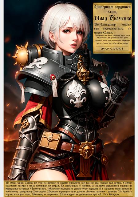 Её зовут зовут София, но если вы купите ей парные пиломечи, то для вас она станет кем угодно. Любит крестовые походы и запах прометия по утрам. Из инквизиции её выгнали за слишком радикальные взгляды по отношению к врагам Человечества, собственно поэтому и решено было передать её в качестве телохранителя почётному гражданину Империума. Кормить трижды в день, давать убивать еретиков – дважды. За бронёй и оружием следит сама. Возврату не подлежит. Рекомендуем не упоминать при ней Гога Вандира.