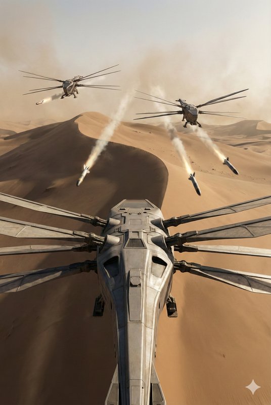 Тяжело груженный «Пепелац» медленно оторвался от поверхности, разбрасывая потоками воздуха остывающую корку на озере спайса. Двигатели выли на взлетном режиме, вибрируя всем корпусом, пока мы метр за метром, набирали высоту. Едва мы поднялись на пятьдесят метро, как интуиция взвыла, предупреждая об опасности. Два хищных, вытянутых силуэта вынырнули из-за высокой дюны прямо по курсу. Они шли в «мертвой зоне», скрываясь за рельефом. А мы медленно поднимались.