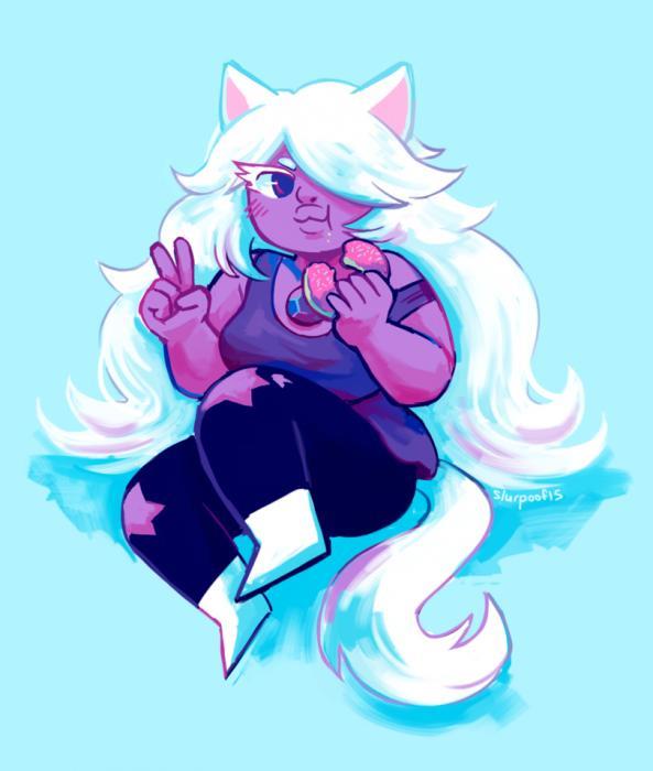 Вообще-то, он хотел полностью превратиться в кота, но, получилось как-то не так. Из-за своей полуорганической природы он не мог трансформироваться так же свободно, как другие самоцветы. Только кошачьи ушки показались из его вьющейся шевелюры. Аметист же не могла оторвать глаз, вдруг осознав, что такой Стивен выглядит просто преступно мило.